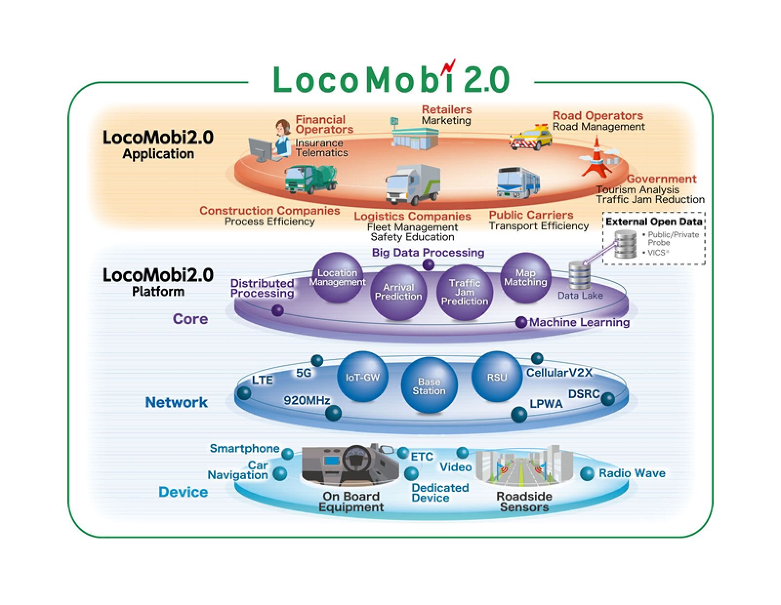 - LocoMobi2.0 Platform collects not only car and roadside sensor data, but external data such as open data, which is derived from government probe etc. By fully taking advantage of our development/analysis expertise, the platform provides functionalities such as location management, traffic jam prediction, arrival prediction and so on.