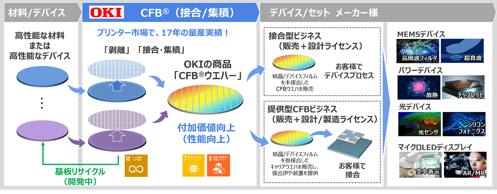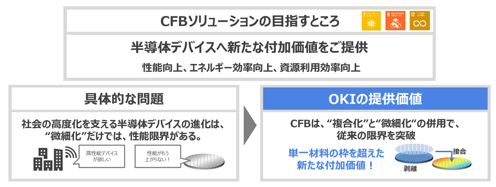 OKIはこれからも、CFB技術を活用したCFBソリューションをベースに、材料メーカー様やデバイスメーカー様との共創を実施し、半導体デバイスの複合化による付加価値向上に貢献します。CFBソリューションによる先端半導体材料活用も視野に入れ、社会課題の解決に貢献していきます。