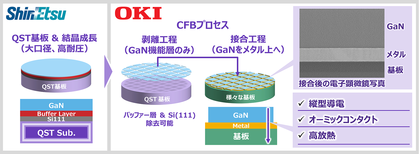 OKIは、信越化学工業株式会社(以下、信越化学)と共同で、信越化学が独自改良したQST基板からOKIのCFB技術を用いてGaN(窒化ガリウム)機能層のみを剥離し、異種材料基板へ接合する技術の開発に成功しました。