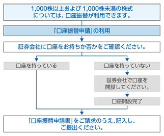 「特別口座」の株主様は今までどおり、ご本人の届出先宛に通知書が届き、株主の権利も確保されますが、「特別口座」のままでは市場での売却ができませんので、日常の管理上ご不便をきたすことがあります。最寄りの証券会社に口座を開設し管理を移すことをお勧めします。