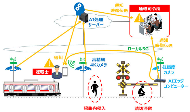 本実証実験では、ローカル5G環境下でカメラとAI画像センシング技術を用いて、「踏切滞留監視」と「線路内侵入監視」の2つの実証実験を行っています。「踏切滞留監視」は、従来3Dセンサー(注3)で検知している人、車などの踏切内滞留を、OKIのAIエッジコンピューター「AE2100」と沿線に設置された低照度カメラを用いて映像から自動検知し、運輸司令所および運転士にリアルタイムで通知するもので、運輸司令所には検知した映像の自動表示も行います。また、「線路内侵入監視」は、高速大容量で超低遅延かつ多数同時接続可能というローカル5Gの特長を活かして、線路内に設置された複数の高精細4Kカメラで撮影された映像を遠隔地にあるAI処理サーバーに伝送し、OKIのAI画像解析技術により踏切や駅ホーム、境界柵からの線路内立入を検知し、同様に通知および映像の自動表示を行います。これらの監視により、踏切や線路敷地内の異常を複数の映像でリアルタイムに確認することができるため、線路敷地内の安全性を向上することが期待できます。