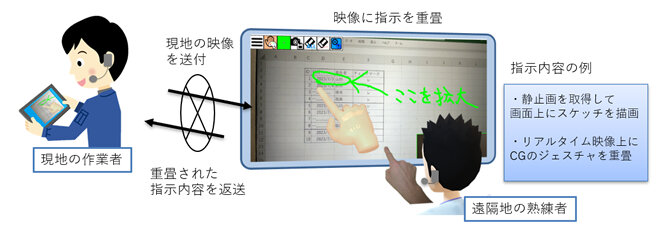 スマートフォンなどのエッジデバイスを活用し、遠隔地からリアルタイムに現場作業を支援するシステムです。通常の映像音声通信に加え、現地を撮影した映像を遠隔地の熟練者に送付し、熟練者側でスケッチやジェスチャなどの作業指示内容を重畳して、作業者側に指示を映像として送付することができます。標準技術WebRTC(注2)を用いているため、一般的なウェブブラウザを搭載した多くのデバイスで利用できます。