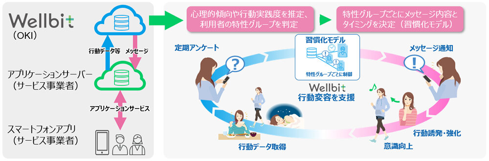 OKIは、独自開発した行動変容技術に基づいて行動の習慣化を支援する行動変容プラットフォーム「Wellbit™(ウェルビット)」を開発しました。Wellbitは、スマートフォンやIoTセンサー(注1)などから収集した利用者の行動や環境の時系列データを分析し、習慣化させたい対象行動に合ったタイムリーな利用者向けメッセージを生成して送信することで、利用者の意識と行動に変化をもたらすソフトウェアプラットフォームです。今後OKIは、Wellbitを活用し、運動や睡眠などの健康的な生活習慣を支援するサービスの開発と商品化を進めます。