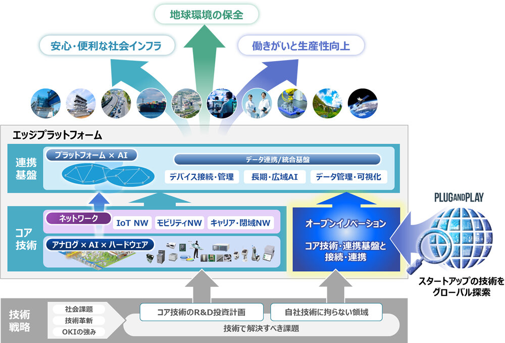 OKIは2023年11月に発表した「技術戦略」において、社会課題をスピーディに解決するソリューション基盤の技術コンセプト「エッジプラットフォーム」(注3)を提唱しました。グローバルなオープンイノベーションは、本プラットフォームの成長に欠かせない活動となります。本プラットフォームをハブとし、スタートアップの成長機会と社会課題の解決に繋げ、共に成長を加速していきます。