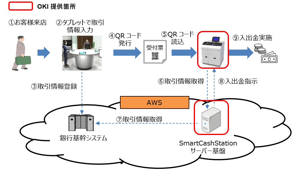 福島銀行では、銀行取引をスマート化させる「次世代バンキングシステム」の構築を進めており、OKIの「SmartCashStation」は、現金取引を行うセルフ操作型入出金機として採用されています。来店されるお客様自身が現金の入出金を行うことで行員の現金タッチレスが可能となるため、事務の負担やミスを削減することができます。また、「次世代バンキングシステム」の銀行基幹システムと連携していることから、銀行のデータベースとリアルタイムで情報共有ができるため、事前に取引情報を入力したタブレットで発行されたQRコード®をかざすだけで入出金操作が可能となり、スピーディーな取引を行うことができます。