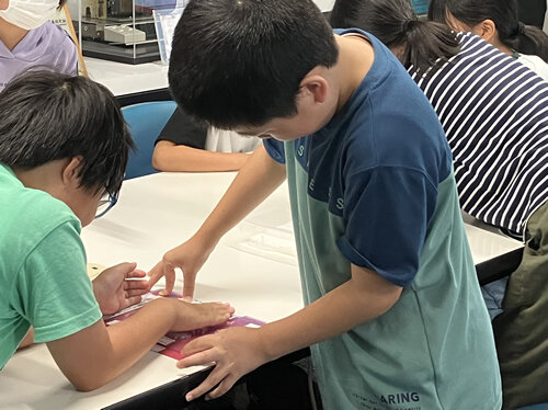 見学後のワークショップでは、静電気を発生させた下敷きを使用した文字の転写体験を通じて、カラーラベルプリンター「PLAVI Pro1050」のトナー印刷の仕組みを学びました。また、新幹線のイラストを長尺印刷する様子を見学し、印刷されたイラストをマイクロスコープで拡大して、カラフルなイラストがプリンターの4色のインクの組み合わせで成り立っていることを確認しました。ワークショップの最後には、記念品として、子どもたちが事前にデザインした図案を印刷したシールと、当日撮影した集合写真を印刷したクリアファイルが、参加者全員に贈呈されました。参加した子どもたちからは、「基板には米粒よりも小さな部品がついていると思っていなかった」「正しい製品をつくるために、たくさんの機械が使われ、いろいろな工夫がされていると思った」などの感想が聞かれました。