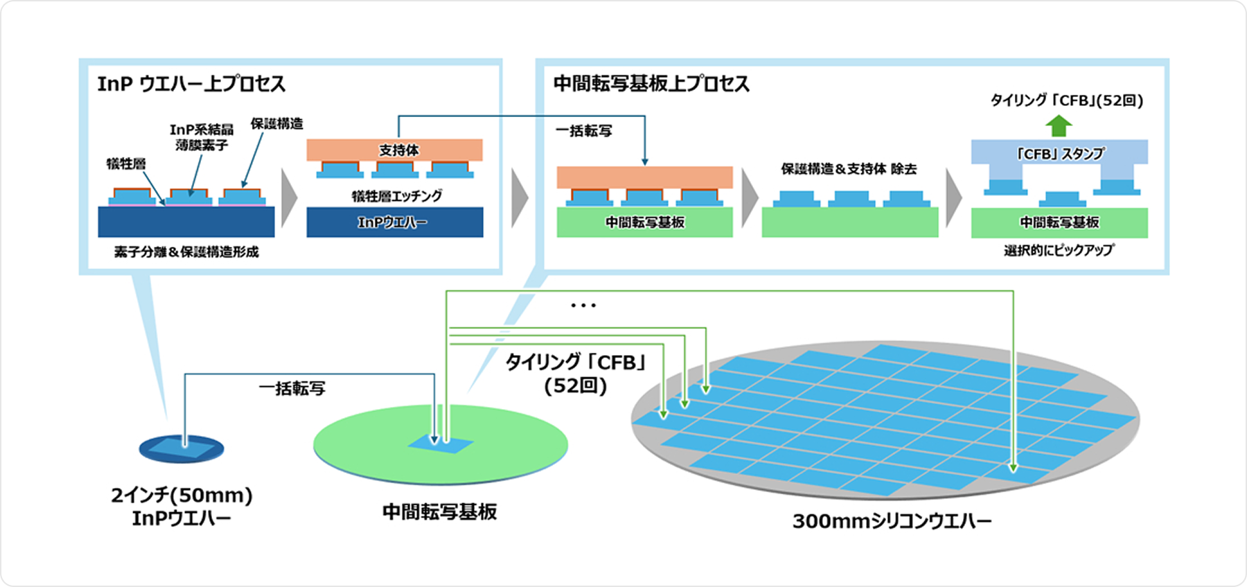 今回、2インチから300mmシリコンウエハーへのタイリング「CFB」技術を実証しました。本技術は3インチや4インチのInPウエハー、200mmシリコンウエハーなどにも柔軟に対応可能です。また、既存の光半導体製品にも応用でき、高放熱基板への転写による性能向上や、大口径化による生産性向上にも寄与します。