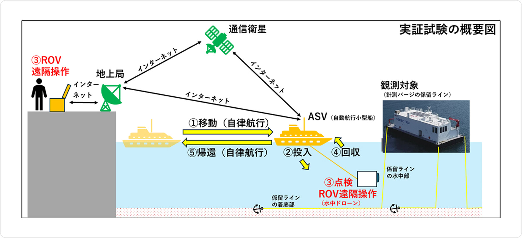 水中を自律探査するAUVの社会実装に向けた最初のステップとして、今回はASVとROVを用いて、将来のAUV化を想定した実証試験を海上で行います。本実証試験では、浮体式洋上風力発電設備に見立てた観測対象(注5)の水中データを無人で取得する技術の有効性を確認します。