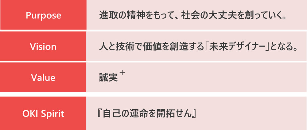 OKIグループが大切にしてきた価値観である「誠実」に加え、社会全体の視点で自ら考え行動する姿勢を示す。 - OKI Spirit:「自己の運命を開拓せん」