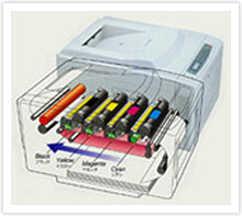 カラープリンタの開発にあたり最初の課題は印刷方式の検討でした。4サイクル方式とタンデム方式があったものの、熟慮の末にタンデム方式を採用。用紙走行路に4色のトナー画像形成ユニットを直列に配置し、搬送される用紙に直接色を重ねていく本方式は、印刷速度が単色印刷と変わらず、4サイクル方式の4分の1。将来的なカラー高速印刷を見据えての判断でした。
