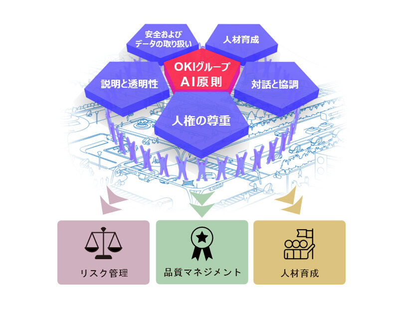 生成AIを中心にAI活用が進む現在、人権問題をはじめとするAIの社会的影響やリスクについても、世界規模で議論が行われています。OKIグループは「OKIグループAI原則」に則り、リスク管理・品質マネジメント・人材育成の3つの観点でAIガバナンスを推進しています。