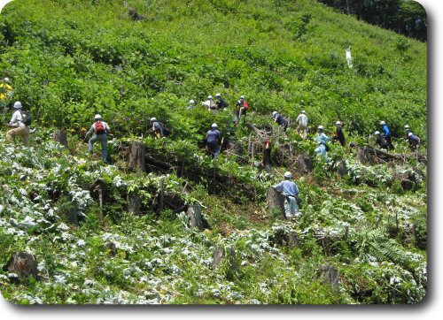 この活動は、自治体、発注者、施工業者、森林業者の四者が連携して、建物に使用した木材伐採跡地の森林再生を目指すという、全国でも稀な取り組みです。今回の下草刈り作業後には、下草に埋もれて隠れていた苗木が姿を現し、直接日光が当たるようになりました。
