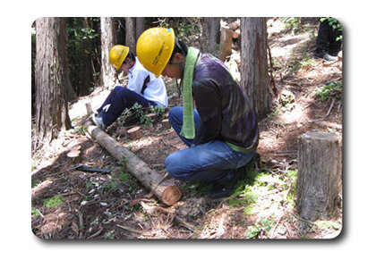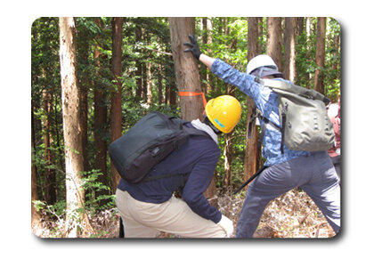 間伐は、森林の成長に応じて木の数を減らし、樹木の一部を間引く作業で、森林保護には必要不可欠な作業です。間伐対象木にはあらかじめテープが巻かれ、地球緑化センターの指導員から安全な木の切り方を教わったあと、数名ずつに分かれて作業しました。