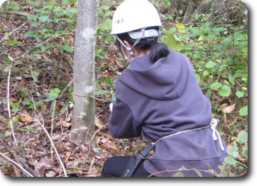 作業内容は、小諸市乙女湖公園 野鳥の森協定地内での除伐です。除伐とは、健やかな木を育てるため、育成中の樹木の妨げとなる木を適切に間引き、森に陽ざしを届ける大切な作業です。参加者は、長野県佐久地域振興局、小諸市役所、ならびに現地で活動する一般社団法人ディバースラインの指導員からレクチャーいただき、それぞれ分担されたエリアの作業に取り組みました。作業を進めるにつれ、森の中に少しずつ陽ざしが差し込み、活動の成果が実感できました。