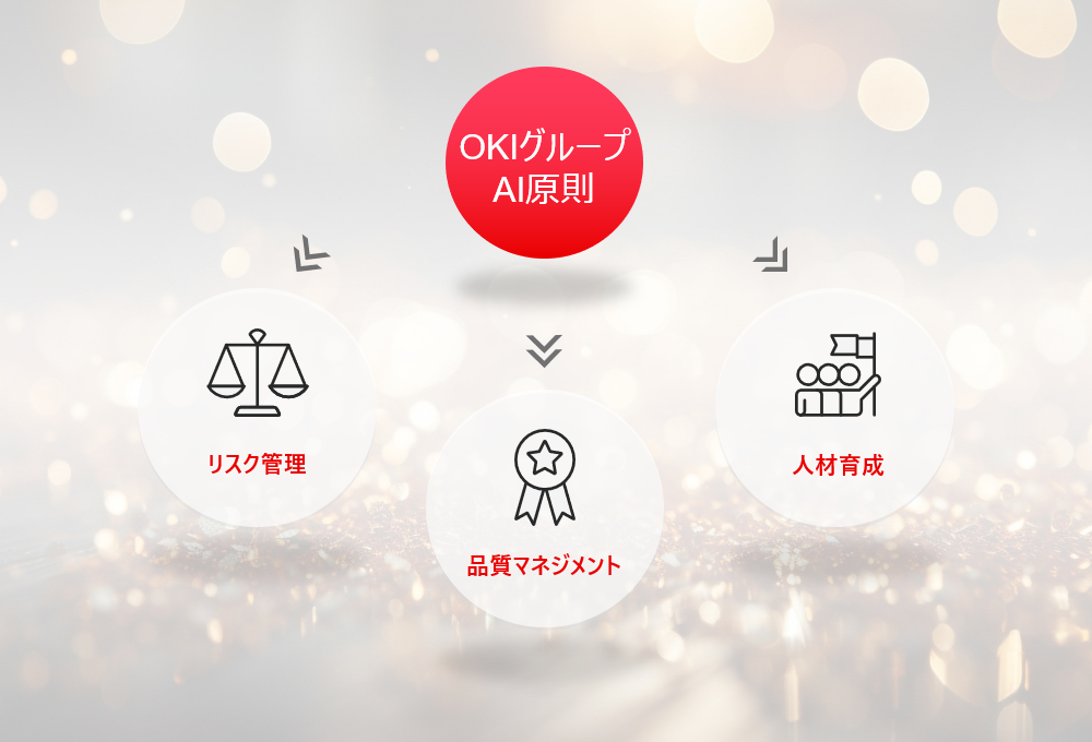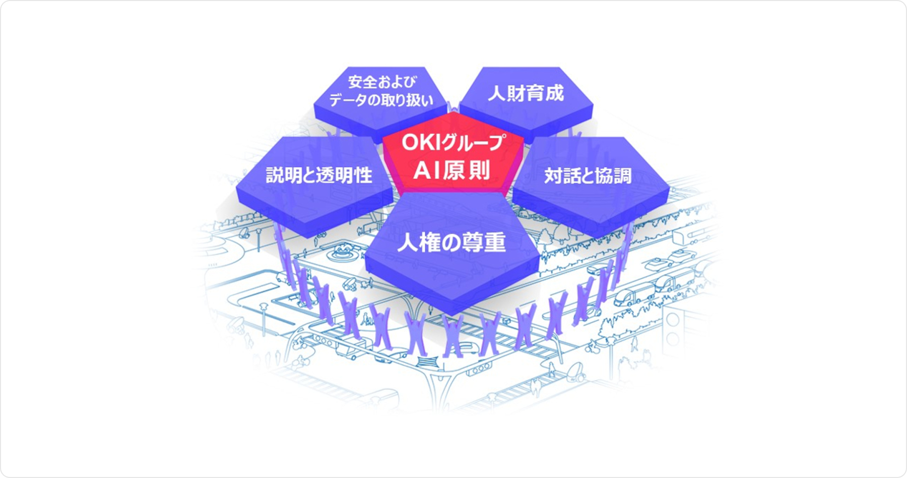 OKIは、人権の尊重・説明と透明性・対話と協調・安全およびデータの取扱い・人材育成からなる「OKIグループAI原則」を策定し、AIに関する企業活動を推進しています。お客様やステークホルダーの皆様に受け入れていただけるAI商品を提供し、人間中心のAI社会実現に貢献します。