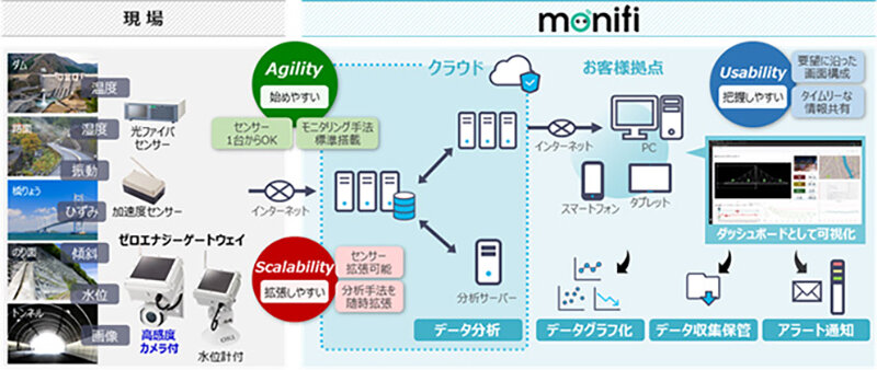 「monifi」は、設置された多種多様なセンサーで取得したインフラ構造物の振動や河川の水位など現場の情報を収集・分析することにより、インフラの劣化進行や災害状況を予測し、最適な予防保全を可能にします。