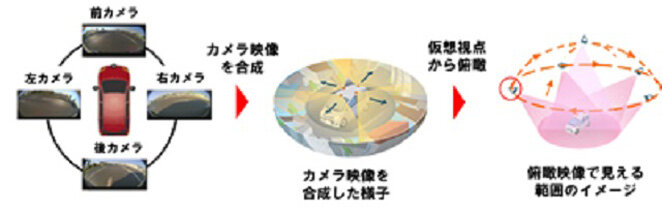 リモートモニタリングシステム「フライングビュー」は映像処理能力の高いFPGA(注1)と小型カメラ4台を組み合わせ、現場で稼働する移動体の周囲360°(進行方向・左右・後方・上空から見た周囲全体など)からの視点で、「人の目」で見やすい高画質かつ鮮明な俯瞰合成映像をリアルタイムに表示します。また、自由視点で再生できる録画機能を持ち、事故やトラブル発生時の周囲状況を再現して確認することも可能です。