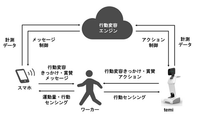 OKIは、健康行動の促進と習慣化を目指した行動変容技術を研究し、一人ひとりの生活習慣に応じた最適な健康行動の提案メッセージを提示する独自のアルゴリズムを開発しています。一方コクヨは、「temi」を活用した健康増進ソリューションの企画を開始しています。今回の検証では、OKIの行動変容エンジンを搭載した「temi」が、笑顔、挨拶、運動など、健康行動を促すメッセージをオフィスで働く人たちに直接語りかけ、それによって生じる健康行動の促進効果を測定します。