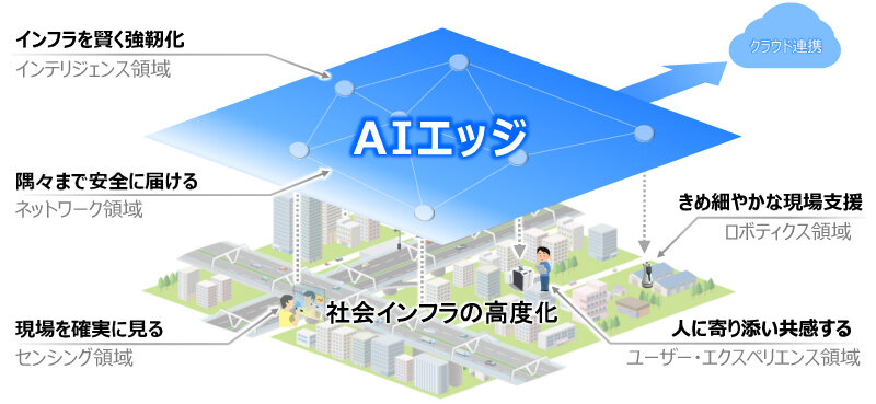 AIエッジは、社会インフラの現場で使われる端末やデバイスが、AIを中心に5G、IoT、ロボットなどのデジタル化の技術革新を取り込み、互いに連携しながら高度に社会課題の解決を狙う技術的な枠組みである(図1)。