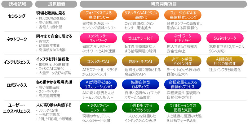 前述のとおりAIエッジは、AI、5G、IoT、ロボットなどのデジタル化の技術革新を取り込んだ広い概念である。これの強化に、OKIは五つの技術領域を定め、研究開発を推進している。クリティカルな現場を確実にみる「センシング領域」、都市部や山間部などを問わず隅々まで安全に情報を届ける「ネットワーク領域」、AIでインフラを賢く強靭化(きょうじんか)する「インテリジェンス領域」、エッジで人やモノに働きかけ、きめ細やかな現場支援を行う「ロボティクス領域」、そして人に寄り添い共感する「ユーザー・エクスペリエンス領域」である。