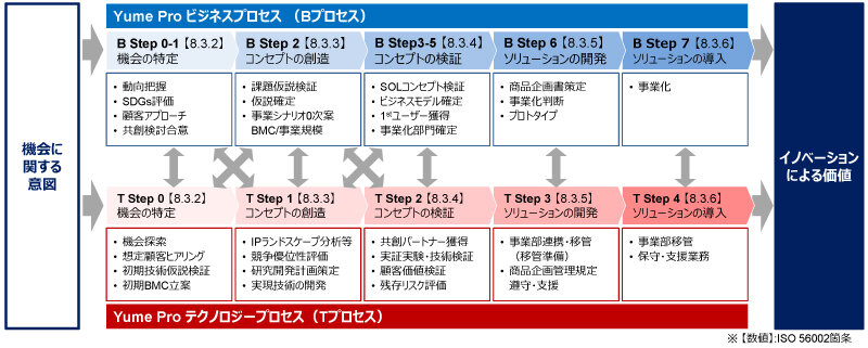 これら五つの技術領域での研究開発は、OKIのIMS「Yume Pro」を用いてマネジメントを行っている。国際標準ISO 56002の箇条8に定義されるイノベーションプロセスを、研究開発活動に合わせて具体化した「Yume Proテクノロジープロセス」である。このプロセスと並行して事業シナリオを構築する「Yume Proビジネスプロセス」を定義し、事業と技術の熟度管理を、進捗の差を許容しながら相互に連携し推進している。