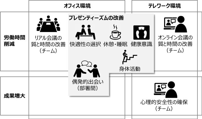 労働時間を削減するためには、ワーカーが業務に集中できるよう職場環境を整えること、また、業務プロセスを見直して無駄な時間を見つけることが重要と考える。このうち、ワーカーやチームの行動レベルで対策が可能な要素として、プレゼンティーズムと会議を取り上げる。