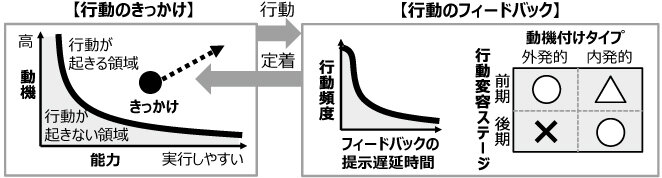 行動の直後に心地よさを引き起こすフィードバックがあれば、脳内にドーパミンなどの化学物質が分泌され、神経回路が強められる。それによって行動の出現頻度が高まり(強化)、逆にフィードバックを与えない場合には行動の出現頻度が低くなる(消去)という学習メカニズムが知られている(参考文献13)。また、行動に対して無関心の状態からすでに習慣化された状態までの五つの段階(行動変容ステージ)に対して、前期のステージでは外発的動機付け(金銭的インセンティブや他者からの評価、強制など)が有効であり、後期のステージでは内発的動機付け(楽しさ、達成感、利他性など)が有効である(参考文献14)。