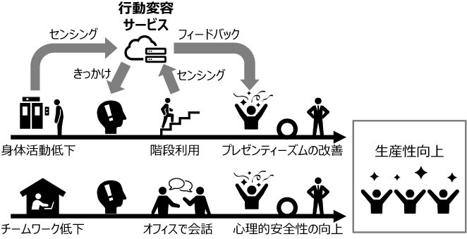 ここでは、オフィス環境で体を動かすことによってプレゼンティーズムを改善し、生産性向上を図る場合を例にとりながら、行動変容技術を紹介する。技術の原理を図2に示す。