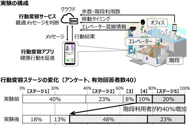 行動変容技術を用いて、オフィスビルでの階段利用促進の実験を行った(参考文献18)。実験システムは、建物内の階段・通路・エレベーターホールに設置したセンサーやカメラ、さらにはワーカー自身が携帯するスマートフォンの内蔵センサーから、ワーカーの行動情報をクラウドに収集し、ワーカーの行動状況に応じて、階段利用などの健康行動を誘発するメッセージをスマートフォンにタイムリーに通知するものである。