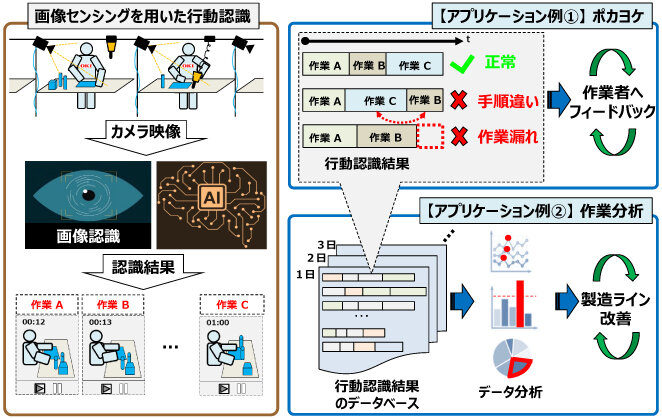 製造ラインでは、各工程の作業者行動をモニタリングすることおよびその内容を数値化することは、品質確保や生産性向上のために非常に重要である(参考文献1)。このような適用先に向け、画像センシングによる詳細な行動認識技術を活用して「現場を見える化」するアプリケーションの例を図1に示す。アプリケーション例①の「ポカヨケ」では、対象工程に必要な一連動作の順番やそれぞれの継続時間などを認識し作業者にタイムリーにフィードバックすることによってヒューマンエラーを防止できる。具体的なヒューマンエラーとしては、異なる部品取り付けや手順間違い、作業漏れなどが考えられる。アプリケーション例②の「作業分析」では、詳細な行動認識技術を活用し、製造ラインの改善に役立てる。具体的には、蓄積された認識結果である個々の工程の動作内容を数値化し統計分析することで、作業のばらつきやトラブル発生時の要因分析ができ、製造ラインの改善につながる。また、このような詳細な行動認識技術を利用したアプリケーションを現場で運用することにより、「副産物として膨大な作業映像を収集することができる。行動認識の結果と作業映像を利用して、未経験作業者の育成などにも活用できる。