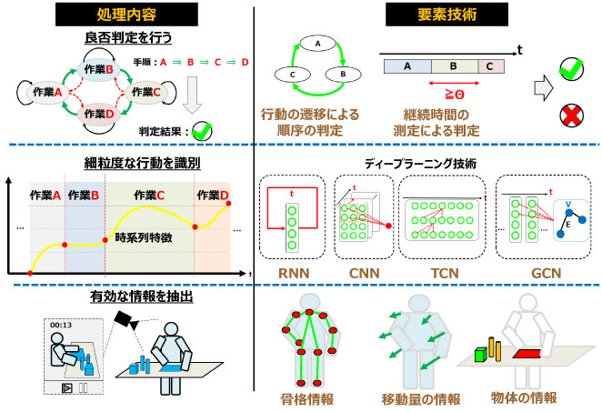 我々は、製造現場向けの作業者の詳細な行動認識を実現するために、用途に応じて「骨格情報などの有効な特徴」を抽出し「時系列ディープラーニング技術」を用いて識別処理を行う。また、アプリケーションによって行動識別結果の時系列情報から、作業手順の正しさや作業の継続時間、また同様の手順を行った回数などを用いて作業自体の良否を判定する(図2)。以降に詳細な行動認識を実現するための要素技術を紹介する。