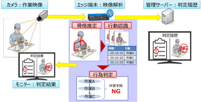 想定する行為判定システム(図3)は、作業者が作業を行う場面をカメラで撮影し、エッジ端末などにより画像認識技術を用いて作業内容や作業手順が正しかったかどうかを判定する。その判定結果を作業者へリアルタイムに通知することで、作業者はその場で作業漏れ、作業ミスに気付くことができる。また、判定結果を管理サーバーに保存することで作業行為の証跡データとして活用できる。