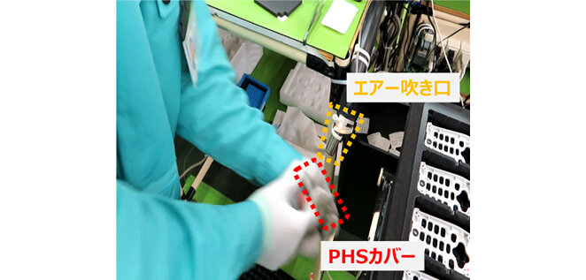エアー吹き作業は、作業者がPHSカバーを左右の手に持ち、作業台に設置してあるエアー吹き口に当ててカバーについた粉塵をエアーにより除去する作業である(図4)。主に作業者の両腕の動きが中心となるため、両腕の「肩」・「肘」・「手首」の関節を骨格情報として抽出し行動の識別に利用する。また、TCNを用いて識別対象となる行動として左右どちらの手でエアー吹きしているかを識別する。