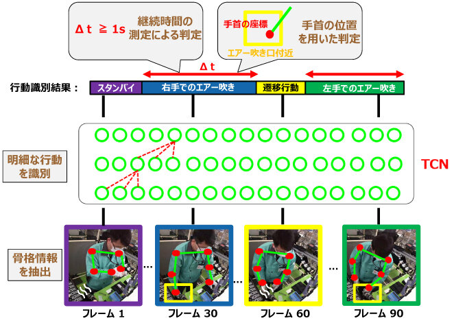 行動認識技術を用いたエアー吹き作業に対する行為判定の有効性を確認するために検証した。検証データを収集するために実際のPHS組立ラインでの正常なエアー吹き作業を撮影した。この正常データは行動識別するTCNの訓練および検証に用いる。また、作業漏れ・作業ミスのあるエアー吹きを実際の作業台で演じることで検証用の異常データを撮影した。検証結果では、正常なエアー吹きに対して誤判定がなく、異常なエアー吹きの判定漏れは起きなかった(表1)。この結果により、詳細な行動認識技術による行為判定がPHSエアー吹きでの作業漏れ・作業ミスの防止に有効であることを示した。今後は、現場で稼働するシステムを構築していく予定である。