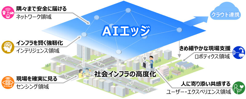 OKIの注力技術「AIエッジ」は、デジタルトランスフォーメーション(DX)を進化させ、社会インフラの高度化に貢献する技術を指している。この「AIエッジ」を強化する先端的な技術領域として五つの技術領域が定義されている(図1)。
