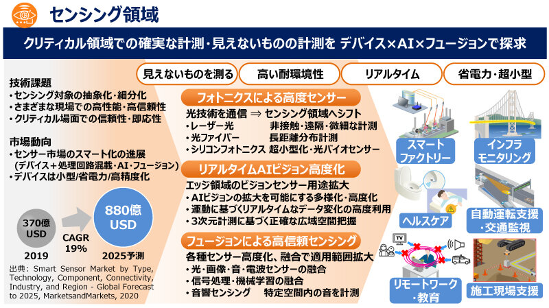 クリティカルな現場の課題解決に向けたセンシングの対象は、設備の振動や道路交通の異常事象、ウィルスの有無など多種多様であり、また、稼働環境も屋外での雨天や吹雪などさまざまとなっている。また、エッジ側でのリアルタイム処理や電力負荷軽減が求められ、AI処理の軽量化、小型で省電力なセンシングデバイスも必要とされている。このような現場からの厳しい要求に対し、OKIは「見えないものを測る」「高い耐環境性」「リアルタイム」「省電力・超小型」をセンシング領域の提供価値と定め、光センサー関連の「フォトニクスによる高度センサー」、二次元・三次元ビジョン関連の「リアルタイムAIビジョン高度化」、およびセンサー融合に関する「フュージョンによる高信頼センシング」の三つの研究項目で、差別化を図りながら研究開発を進めている。