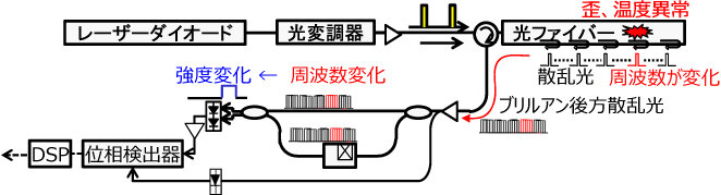 我々は、光通信技術を活かした独自の信号処理SDHBOTDR(自己遅延ホモダインブリルアン光時間領域反射測定法)を開発した(図3)。特長として、従来のBOTDRに比べて大幅な高速化、かつ、空間分解能の向上が挙げられる。