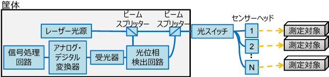 我々は、通信で培ったデジタル光信号処理を応用し、S/N比の高い多点型レーザー振動計を開発した(図4)。特長としては、光スイッチによる多チャネル化、および光ファイバーによる長延化が挙げられる。一台で100ch以上の多点、100m以上の広範囲、数Hz~数百kHzの広帯域の計測が可能であり、非接触のため、動作中の可動部、高・低温体など従来の接触型振動計では難しかった計測も可能となる。
