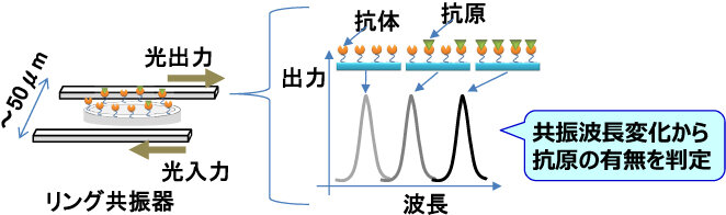 我々は、光通信用に開発してきたシリコンフォトニクス技術を用い、光導波路上での抗原抗体反応による液体の濃度変化を共振波長の変化として捉える超小型なバイオセンサーへ技術展開し、高精度でリアルタイム計測が可能な技術を開発した(図5)。
