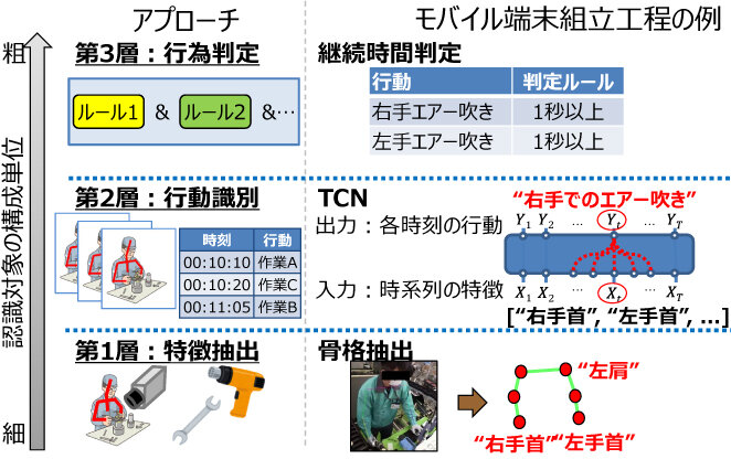 特に動画像に対する行動認識に力を入れ、画像特徴から意味を持つ行動へと、認識対象の構成単位を細かいものから粗いものへ3層で認識する行為判定技術の開発を進めている(図6)。まず、第1層で骨格抽出を用いて行動を認識するために必要な特徴を抽出する。次に、第2層で時系列畳み込みニューラルネットワーク(TCN)を用いて短い時間の行動を識別する。最後に、第3層で行動識別結果の時系列情報から、作業手順の正しさや作業の継続時間から作業自体の良否を判定する。特長としては、層を分割することにより、各工程で共通的に利用可能な部分と個別にカスタマイズが必要となる部分を明確に切り分け、さまざまな現場への適用を効率化可能な点が挙げられる。