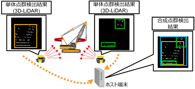 OKIのAIエッジコンピュター「AE2100」上で動作可能な、軽量で高精度な物体検出・追跡技術を実現し、さらに、複数センサーを連携することによる広域監視技術を開発している(図7)。特長としては、個別のセンサーに付随するAE2100で処理した物体検出結果をホスト端末に送信して統合する方式で、検出物体の点群データもホスト端末に送信して合成することにより、重機の形状判別などのより高度な分析が可能となる点が挙げられる。