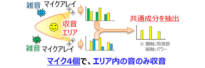 目的音以外の雑音を除去するために、特定のエリア内の音のみを収音するエリア収音マイクの開発を進めている。二つのマイクアレイの指向性の重なりが目的音を収音したいエリアを形成するように設置し、目的音が二つのマイクアレイに同時、かつ、同じ大きさで抽出されることを利用し、特定のエリア内の目的音のみを抽出している(図8)。特長としては、従来のマイクアレイでは目的音と同じ方向にある雑音も拾ってしまうという課題の解決が可能である点が挙げられる。