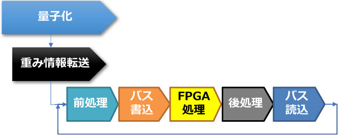 一般的なFPGAを用いたAIアクセラレーションのフローを図1に示す。まずFPGAでAI推論を行うNNモデルを8bitに量子化する。これは学習済みNNモデルごとに一度だけ実行すればよい。続いて推論処理を開始する前に、量子化したNNモデルの重み情報をFPGA上に転送する。その後バッチと呼ばれるAI推論処理の単位ごとにデータが入力され、前処理、バス書込、FPGA処理、後処理、バス読込が繰り返されて推論が行われる。このFPGAを利用した推論の逐次処理がCPU単体での推論時間より早い場合には、AIアクセラレーターとして有効である。