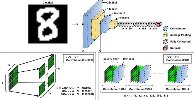 まず本検討では単純なCNN(Convolutional NeuralNetwork:畳み込みNN)モデルとして広く知られるLeNet(参考文献2)を基にして、手書き数字を認識するカスタムモデルを作成した。このNNモデルの入力は28x28ピクセルのMNISTデータベースとし、出力は0から9の数字での評価結果を返す。このNNモデルのレイヤー構成を図2に示す。
