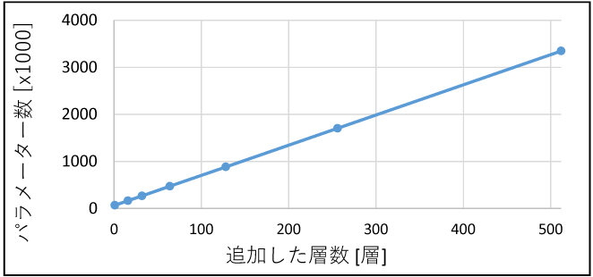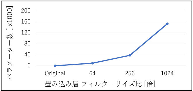 具体的にはパターン①ではレイヤーサイズ拡大の影響を確認するために、入力層に近い畳み込み層のフィルターサイズを変えることでパラメーター数を増加した。(図2 パターン①)フィルターサイズはオリジナルモデルを1とした場合に、64、256、1024倍のNNモデルとした。対してパターン②のレイヤー層数増加の影響確認では、NN内の畳み込みレイヤーの層数を増やすことでパラメーター数を増加した。(図2パターン②)拡張したレイヤーは16、32、64、128、256、512層である。パターン①およびパターン②で生成したNNモデルのパラメーター数を、図3と図4にそれぞれ示す。