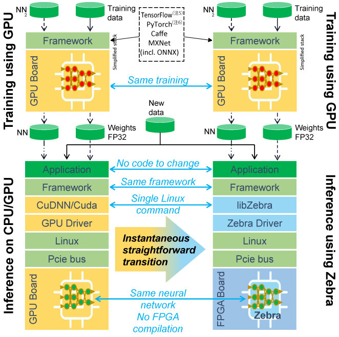 またA IアクセラレーションプラットフォームとしてMipsology(注4)社のZebra(注4)を利用した。ZebraプラットフォームはFPGAの回路情報と、その回路情報を利用するための各種ライブラリー、ドライバーから構成される。Zebraプラットフォームの概要を図5に示す。