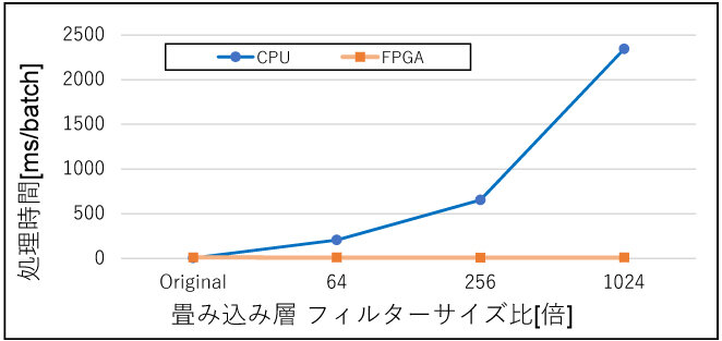 CPUとFPGAの推論時間の比較結果より、FPGAでアクセラレーションを行うのに適しているのは、「レイヤーサイズが大きく、レイヤー層数も多い大規模なCNNモデル」と判断できる。これはCPUに比べてFPGAは動作クロックが低いが、リソースが許す限り並列計算できるために、パラメーター数の大きいモデルでは顕著にCPUよりも推論時間が短くなることを意味する。当然ながらFPGAで同時に行える並列計算には上限があり、FPGA上にプログラミングされたI Pコアの内容に依存する。大規模なNNモデルをFPGA上でアクセラレーションするためには、モデルサイズに見合ったIPコアとFPGAデバイスの選定が必要になる。