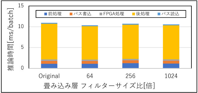 図6より、フィルターサイズ(≒レイヤーサイズ)が大きくなった場合にはCPUの推論時間が大きく増加しているが、FPGAの推論時間にはほぼ変化がなかった。CPUの推論時間の変化の傾向は図3とほぼ一致し、CPUの推論時間はパラメーター数に依存していると判断できる。対してFPGAの場合には、レイヤーサイズが、推論時間には影響しない。FPGAの推論時間の内訳である図7を確認しても、レイヤーサイズの変化による影響は見られない。レイヤーサイズが1024倍(パラメーター数160,000)程度であれば、本環境のFPGAで実施した場合には、瞬時に計算されることを意味する。