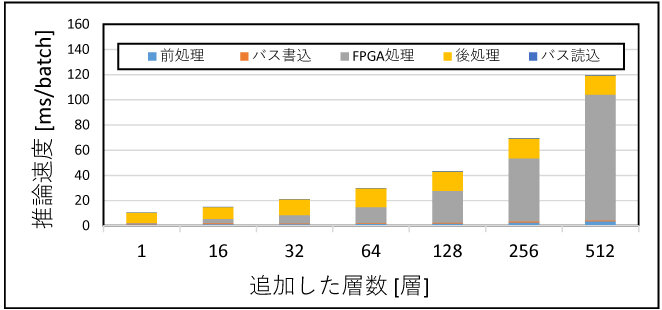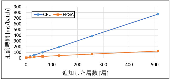続いてパターン②のレイヤー層数の増加が推論時間にどのような影響を与えるかを確認するために、畳み込み層を最大で512層追加し、CPUとFPGAで動作を比較した。結果を図8に、またFPGAの推論時間内訳を図9に示す。