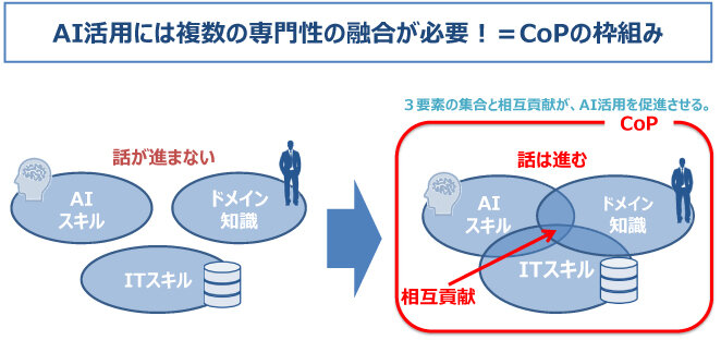 これらのスキルを持ったメンバーは一般的には所属している部署や地域が分散し、関心や熱意があっても単独でAI活用を進めるのが難しい。そこで公式なコミュニティとしてAI-CoP活動が有効である。活動のポイントは関心や熱意つながれたコミュニティであるところにある。